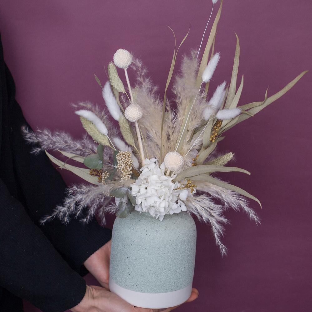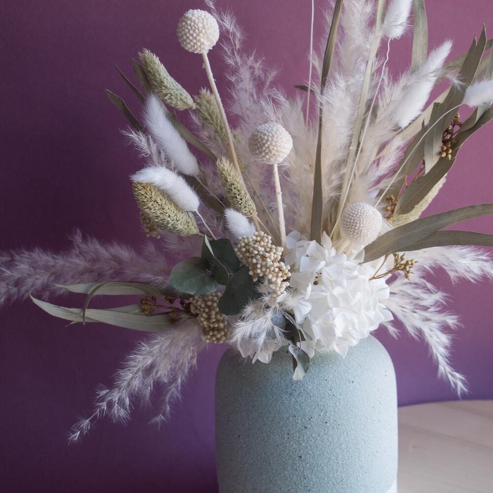 краспедия стабилизированная – 3 шт.гортензия стабилизированная – 3 шт.Лагурус – 9 шт.кортадерия – 10 шт.Фаларис – 8 шт.Эвкалипт сухоцвет – 14 шт.