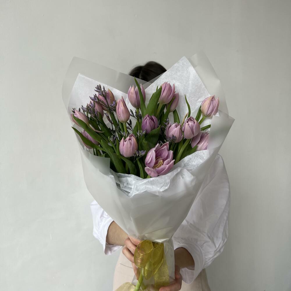 Лимониум – 1 шт.Тюльпан – 15 шт.Упаковка – 1 шт.