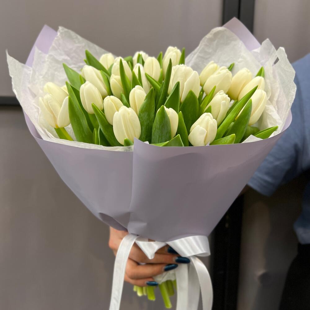 Лента атласная – 2 шт.Тюльпан белый – 25 шт.Пленка матовая – 2 шт.Тишью белое – 2 шт.