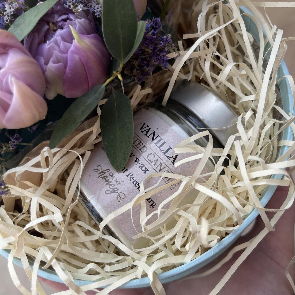 Лимониум – 1 шт.Тюльпан – 5 шт.Эрингиум – 1 шт.Упаковка дизайнерская – 1 шт.Свеча ароматическая – 1 шт.