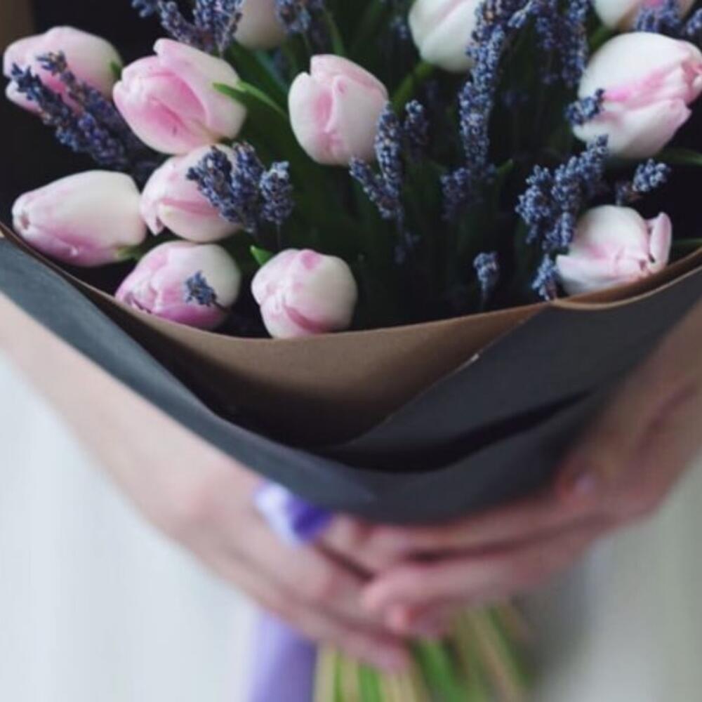 Лаванда (сухоцвет) – 56 шт.Лента – 1 шт.Тюльпан – 25 шт.Крафт упаковка – 1 шт.