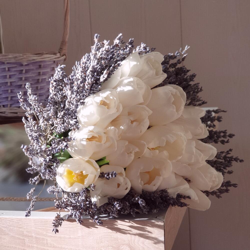 Лаванда (сухоцвет) – 150 гр.Лента органза – 1 шт.Открыточка с вашими пожеланиями – 1 шт.Шпагат джутовый – 1 шт.тюльпаны белые голландия – 15 шт.любовь флориста (бесплатно) – 1 шт.