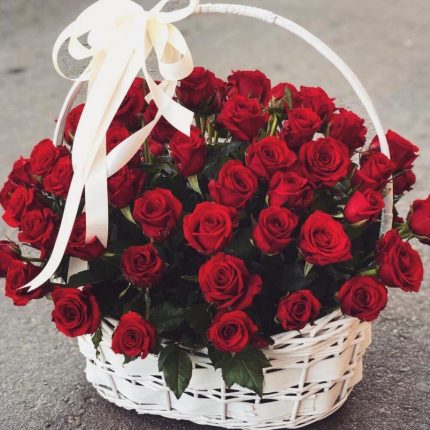 Корзина Прекрасная Иллюзия из роз сорта капучино, фридом, эустомы и кустовых роз