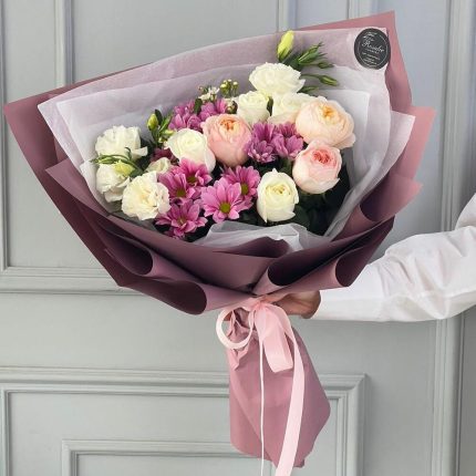 Пышный нежный и ароматный букет “Рассвет в любви” с розами, эвкалиптом, лизиантусом и генистой
