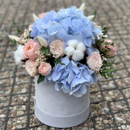 Шляпная коробка с розами, гвоздикой, гипсофилой и антуриумом “Kenzo box”